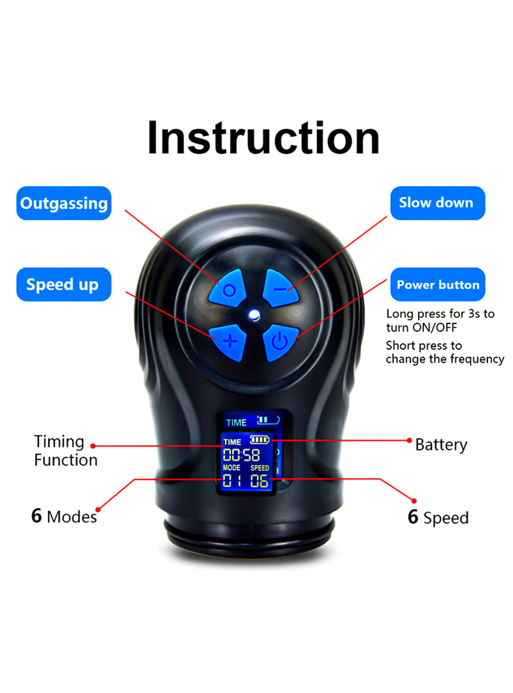 5. Please press (exhaust key) or-key (shitt down key) long for deceleration or stop. If the exhaust speed is too fast, leadingto the penis with pull pain or discomfort.Please adjust to the pressure you feel most comfortable based on yourpersonal condition.