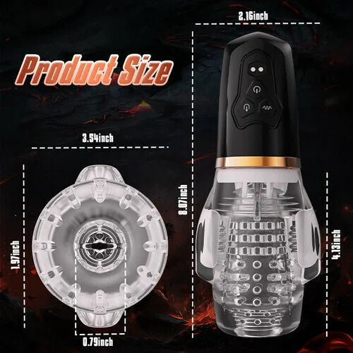 Rocket features a high quality dual motor inside, with intense electrical vibrations that drive your parts almost crazy and rotate to drive you to absolute orgasm. The portable and handheld design makes it easy to adjust the mode. Delight yourself with very simple operation for double stimulation. The masturbation cup looks like a woman's mouth and can completely swallow your tail, performing oral sex as if you were sucked into a tornado! The friction drives you crazy with the internal 3D particles and projection. Made of premium material which is suitable for a variety of different widths. It lies very well in the hand and is not too heavy, Enjoy it!